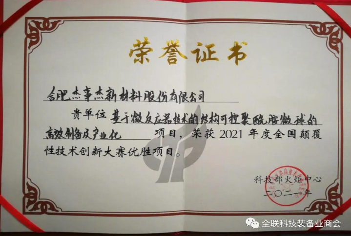 2021年12月28日,由科技部主办的全国颠覆性技术创新大赛领域赛(新材料,高端装备制造、未来网络与通信)在青岛开赛。我会常务理事单位合肥杰事杰新材料股份有限公司参赛项目“基于微反应器技术的结构可控聚酰胺微球的高效制备及产业化”荣获优胜奖,标志着公司在结构可控聚酰胺微球制备及产业化方面得到国家权威部委的认可。
