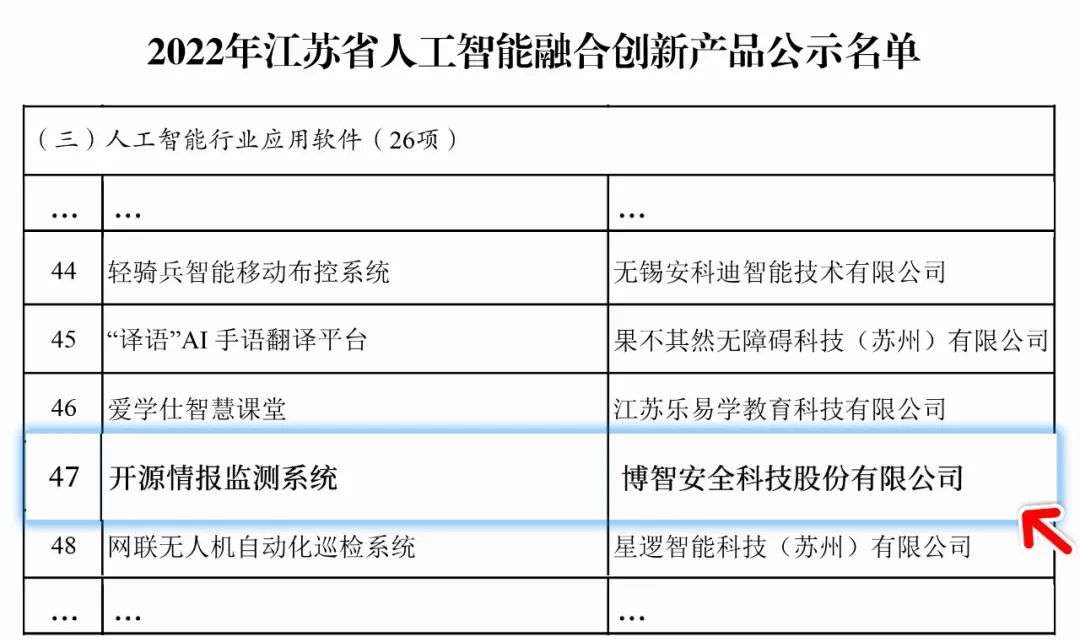 近日,江苏省工业和信息化厅发布”2022年江苏省人工智能融合创新产品“评选结果公示,我会理事单位博智安全科技股份有限公司”开源情报监测系统“凭借创新程度高、应用价值大、示范效应强、市场前景好,经企业申报、各市推荐、形式审查、专家评审、厅内会审等严格程序,成功入选2022年江苏省人工智能融合创新产品名单。