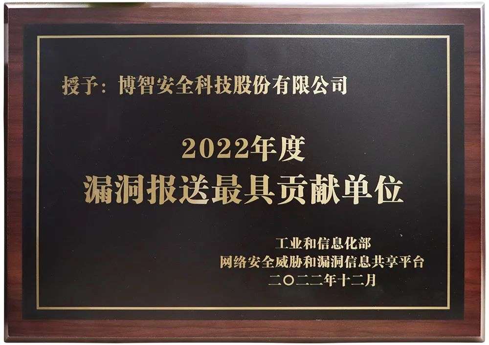 此次荣获工信部“2022年度漏洞报送最具贡献单位”荣誉称号,充分证明了博智安全在漏洞挖掘领域的技术实力。博智安全将持续提升漏洞挖掘及服务能力,为国家网络安全贡献力量。