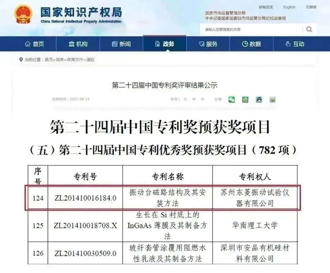 近日,国家知识产权局公示了第二十四届中国专利奖评审结果,我会副会长单位东菱公司的“振动台磁路结构及安装方法”发明专利(专利号:ZL201410016184.0)获得中国专利优秀奖。