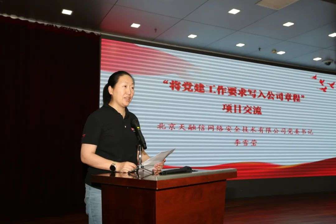 为充分发挥党建引领作用,中关村科学城综合党委决定在各企业党组织中普遍推广实施“红创”党建重点项目。天融信科技集团党委书记、董事长李雪莹博士对天融信“党建入章程”工作的具体做法和效果进行了经验分享和发言。