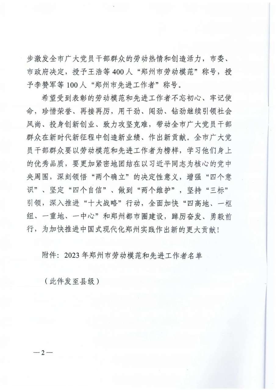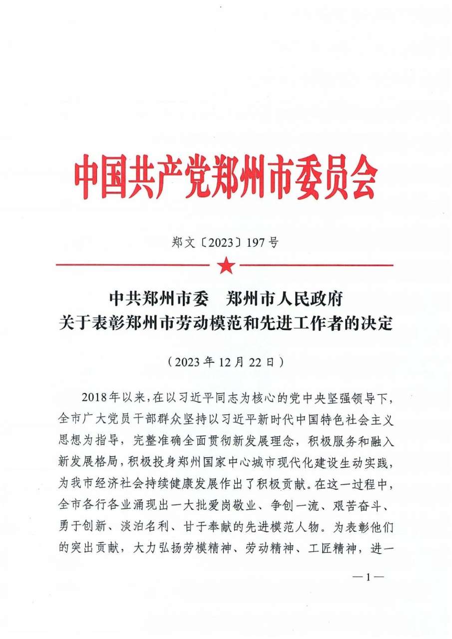 12月22日,郑州市市委、市政府印发《关于表彰郑州市劳动模范和先进工作者的决定》,郑州佛光发电设备股份有限公司主任设计师获评“郑州市劳动模范”荣誉称号。