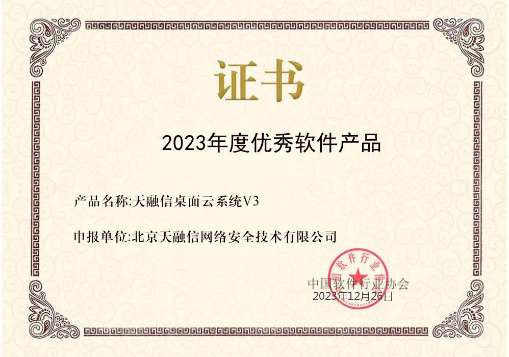 天融信桌面云获中国软件行业协会“2023年度优秀软件产品”
