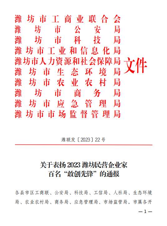 近日,潍坊市工商联、潍坊市公安局、潍坊市科技局、潍坊市工信局、潍坊市人社局、潍坊市生态环境局、潍坊市农业农村局、潍坊市商务局、潍坊市应急局、潍坊市市场监管局联合印发《关于表扬2023潍坊民营企业家百名“敢创先锋”的通报》,表彰认真贯彻落实中央、省、市决策部署,聚焦绿色低碳高质量发展,扎根实业、深耕主业,创新发展、主动求变,敢创敢为、奋力争先的优秀企业家。公司董事长兼总裁王兆连荣获潍坊民营企业家百名“敢创先锋”称号!