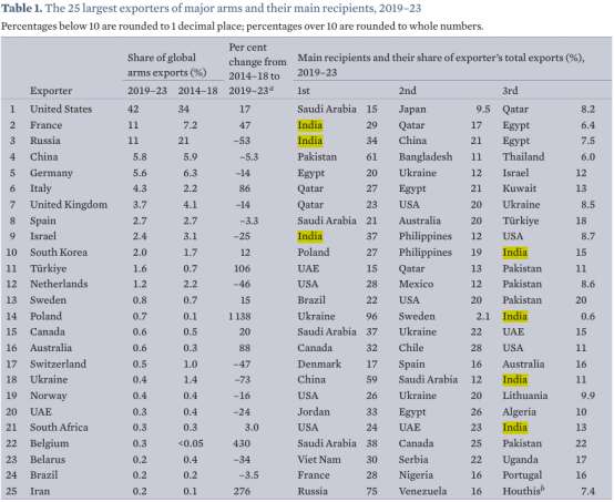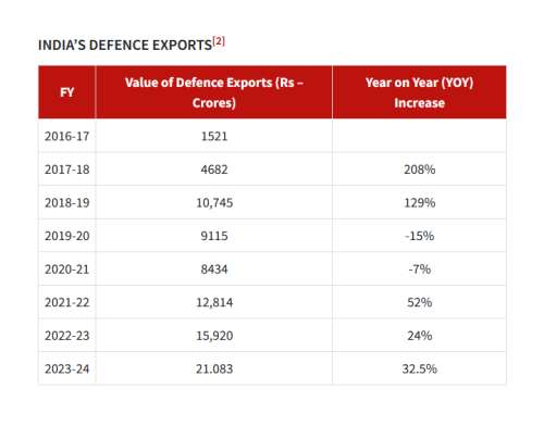 2024年4月1日印度国防部宣布,2023/2024财年印度军品出口额达到2108.3亿卢比(约26.3亿美元),同比上一财年的15.92亿卢比增长了32.5%。尽管SIPRI(斯德哥尔摩国际和平研究所)在2024年3月11日发布的关于“2019-2023年国际武器转让”中,印度国防产品出口额并未进入全球前二十五,但相比10年前的数据迅速增长了31倍达到史上最高值。印度国防部长Raksha Mantri在社交网络平台上发帖称达到国防出口的新里程碑。