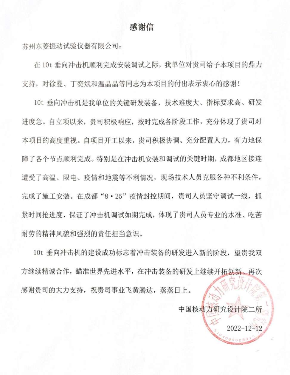 近日,我会副会长单位东菱公司收到中国核动力研究设计院发来的感谢信。信中,核动力院对10吨垂向冲击机项目组在设计研发、安装调试全过程中展现出的专业的技术实力、强烈的担当意识和吃苦耐劳的精神风貌给予了高度赞扬和感谢,并表示愿与东菱公司在今后的装备研发中继续精诚合作,共铸辉煌。
