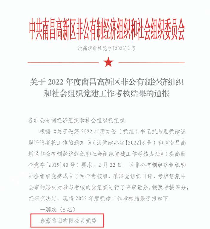 泰豪公司党委在南昌国家高新区“两新”组织党建年度考核中再度名列前茅