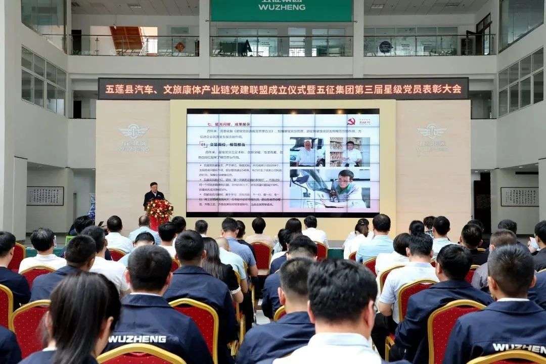 为推动党建链与汽车产业链、文旅康养产业链深度融合,以党建引领企业高质量发展,5月31日,五莲县在五征集团召开汽车、文旅康体产业链党建联盟成立仪式暨五征集团第三届星级党员表彰大会。市北经济开发区党工委书记、管委会主任陈常永,县委常委、统战部部长卢绪龙,县委常委、组织部部长柴岚民出席会议,县委组织部、县工信局、洪凝街道等部门负责人以及汽车、文旅康体产业链党建联盟成员单位负责人,五征集团各党支部书记、第三届星级党员参加了会议。会议由陈常永主持。